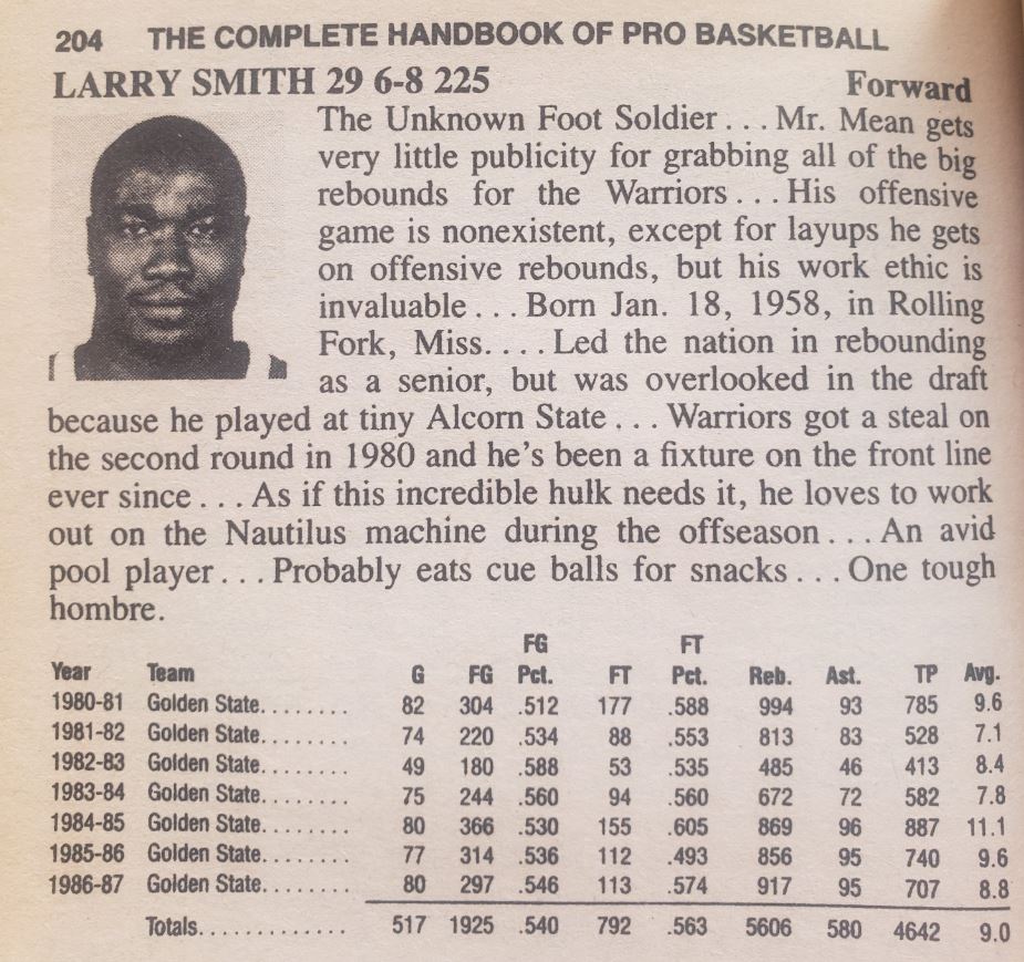 C’est dans un court entretien avec le journaliste Tim Roye que l’on apprend sans surprise que le premier amour de Larry Smith n’est pas le basket, mais le baseball, où il se régale en jouant first base durant son enfance et adolescence, lui le natif d’une petite bourgade du Mississippi. Croissance aidant, c’est par défaut qu’il s’essaie à la balle orange, avec un succès immédiat puisqu’ il intègre à 19 ans une petite fac de son État, Alcorn State. Après lui, seul Lindsey Hunter connaîtra une carrière NBA digne de ce nom, en étant passé par cette université de seconde zone.
