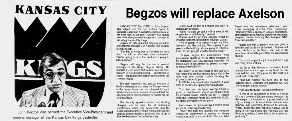 John Begzos est aux commandes du sportif. Il a postulé de son propre chef. Nommé General Manager en 1979, à seulement 37 ans, il débarque auréolé d’un bon bilan aux Spurs : cinq saisons de playoffs et une transition réussie de l’ABA vers la NBA. Avec une fréquentation en hausse année après année pour la franchise texane. Il est jeune, ambitieux, charismatique, et obtient les pleins pouvoirs sportifs. On le décrit comme une figure montante, à mi-chemin entre Don Nelson et Pat Williams. Son crédo est de s’amuser en gagnant. Aux Spurs, il avait été à l’initiative de la création d’un groupe de supporter, les Baseline Bums, sorte de kop à l’européenne là pour mettre l’ambiance. Un homme du marketing, pensant à l’expérience des fans, parfait pour des Kings dont la vente de tickets est en baisse.