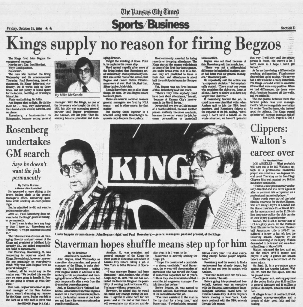 Fin octobre 1980, juste avant le début de la nouvelle saison NBA, la nouvelle tombe : John Begzos est limogé. Le communiqué officiel ne donne aucune raison. Interrogé par le Kansas City Times, le président Paul Rosenberg Jr. esquive : « Ce n’est ni un problème de personnalité, ni de basketball ». La presse locale finit par creuser et découvre une affaire ubuesque : Begzos aurait acheté 1 600 timbres à moitié prix via une connaissance de sa mère. Ces timbres, censés être neufs, étaient déjà oblitérés. Il les aurait ensuite revendus à la franchise à leur prix d’achat (120 dollars), économisant quelques dizaines de dollars… au prix de son poste. Pire move de l’histoire ! Digne des Pieds nickelés.